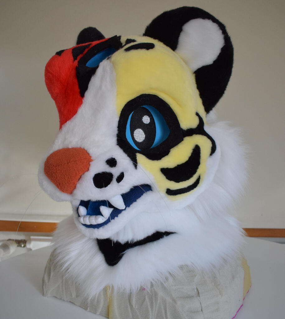 My bases are hand carved from foam and I use high quality faux fur. I like working with soft parts but I'm open to create certain parts with 3D printing, for example teeth, claws and horns. My fursuit eyes are 3d printed and hand painted. Heads and handpaws are always fully lined except for the neck. Feetpaws are lined and made with a sockpaw style. For handpaws and handclaws I use Kloofsuits and Stuffed Tail Fursuits patterns. For feetpaws I use Spilt Grape Soda patterns.