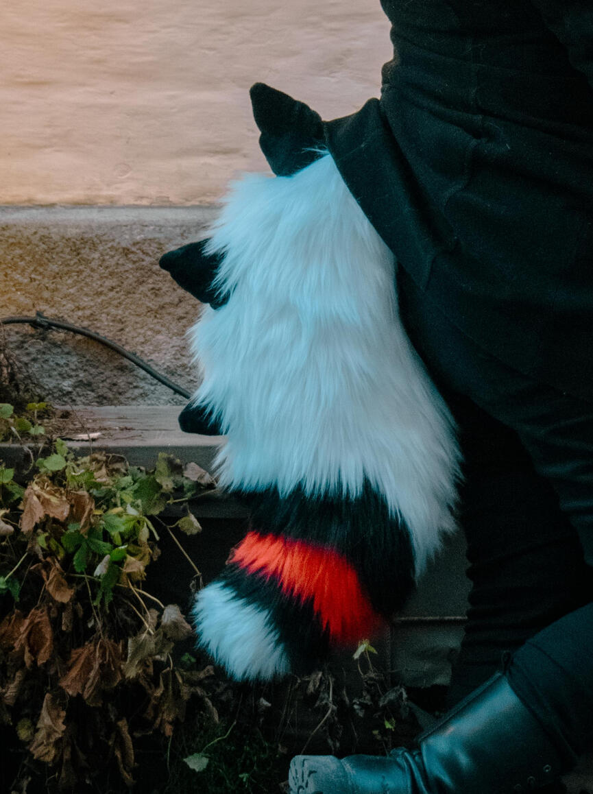 Most tails will come with a zipper to get the stuffing out for washing. A zipper can be added to feetpaws as well. Take the stuffing out and turn the tail inside out if possible. To protect the fur from getting pulled by the machine, put the parts in a laundry bag (a pillow case/duvet cover works as well.) ALWAYS use gentle and low spin cycle and cold or up to 30C water. Do not tumble dry! Gently brush the parts after washing and hang them up to air dry in front of a fan. Brush out the fur every now and then while the parts are drying.