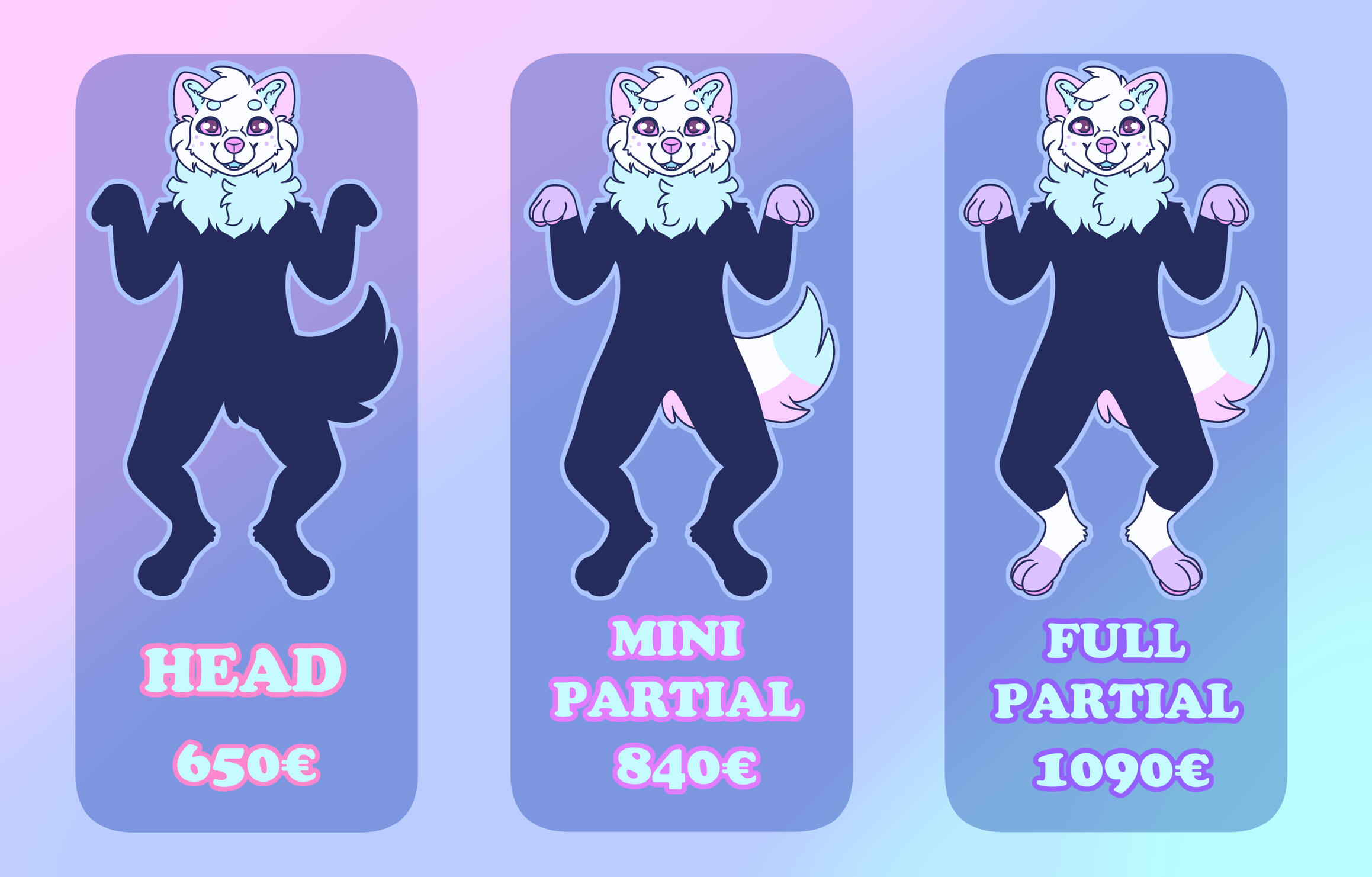 • !!!BEFORE COMMISSIONING BE SURE THAT YOU'RE FINANCIALLY ABLE TO BUY A FURSUIT!!!• All the prices listed are in EUROS (€) and thus all the payments must be made in euros!• Payments will be done via PayPal or Finnish bank tranfer.• The prices shown in my pricing base are base prices. Things like fur and minky colors and complexity of the character will make the price go up.• You need to DM me to get a spesific quote.• I require a 30% down payment before I start the commission. This 30% is ALWAYS NON-REFUNDABLE. The down payment must be paid in a week from me accepting your commission.• Payment plans can be discussed.
